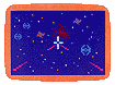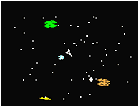 If the enemy spacecraft look familiar, it's because they are Cylon raiders from the late-seventies TV program Battlestar Gallactica. One of Mattel's subsidiaries, Concepts 2000, had the license to produce Battlestar Galactica electronic toys, so it was figured to be a lock that Mattel would get the license to produce the official Battlestar Gallactica videogame. Wrong. The game was well into development when they discovered Mattel didn't get the license. The name was changed, but the graphics remained the same.